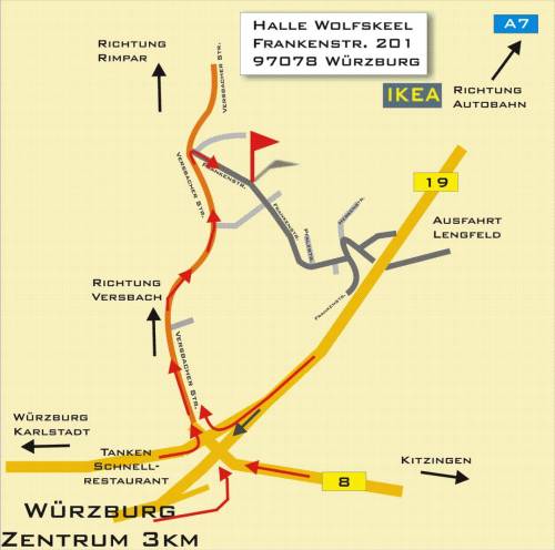 - Auf B19 Richtung Würzburg; ca. 6 km bis Ortsschild