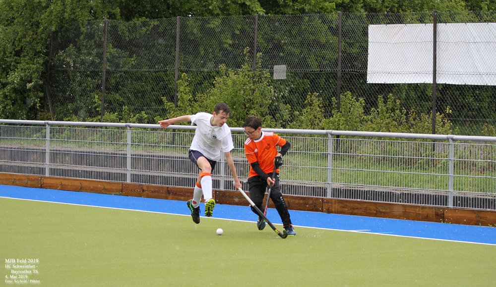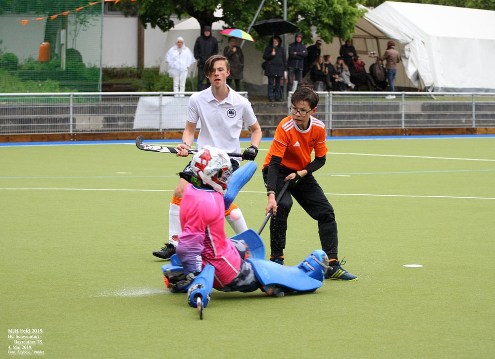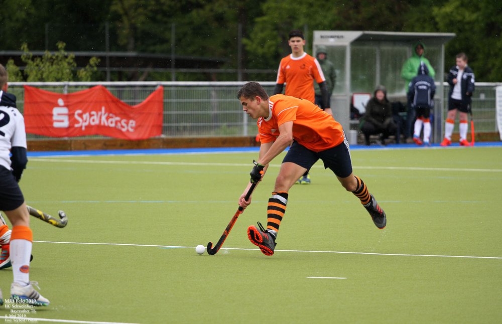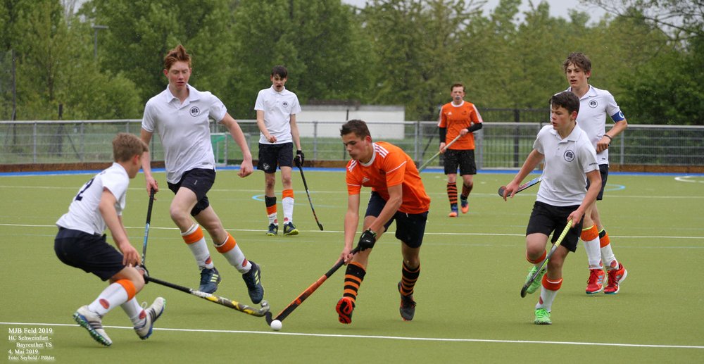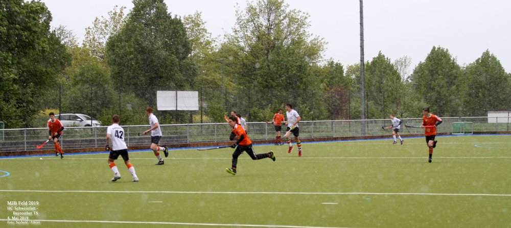 Ein etwas gewöhnungsbedürftiger Anblick bieten momentan die Spieler der männlichen Jugend B des HTCW. Sie sind nicht im gewohnten Rot-Blau auf dem Feld, sondern in Schwarz-Orange des HC Schweinfurt. Der Grund ist einfach: In Würzburg gibt es zur Zeit nicht genügend Spieler dieser Alterklasse für eine komplette Groß- / bzw. Kleinfeldmannschaft. Das ist ein Problem, welches im Hockeysport mittlerweile weit verbreitet ist und eine Herausforderung für die Zukunft der Vereine darstellt. In Würzburg wird zum Beispiel mit dem Programm des Schulhockeys eifrig und erfolgreich um Nachwuchs geworben. Um trotzdem spielen zu können, verbringen unsere Jungs die diesjährige "Sommerfrische" etwas weiter im Norden und kämpfen in den Reihen des HC Schweinfurt um sportliche Erfolge. An diesem Wochenende beispielsweise gegen den Bayreuther TS, und zwar siegreich. Bei leichtem Schneefall und Temperaturen knapp über dem Gefrierpunkt endete das Spiel 3:1 (1:1 zur Halbzeit) für den HCS.